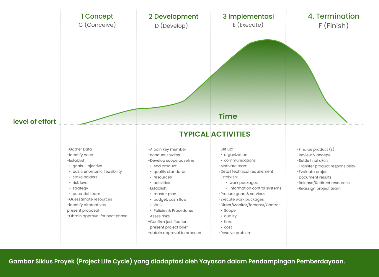 Pemberdayaan masyarakat umumnya dibagi dalam beberapa fase yaitu dimulai dengan fase assessment awal, piloting dan implementasi proyek pemberdayaan dan diakhiri dengan monitoring dan evaluation dalam pengukuran dampak pemberdayaan terhadap penghidupan masyarakat. Gambar Siklus Proyek (Project Life Cycle) yang diadaptasi oleh Yayasan dalam Pendampingan Pemberdayaan.